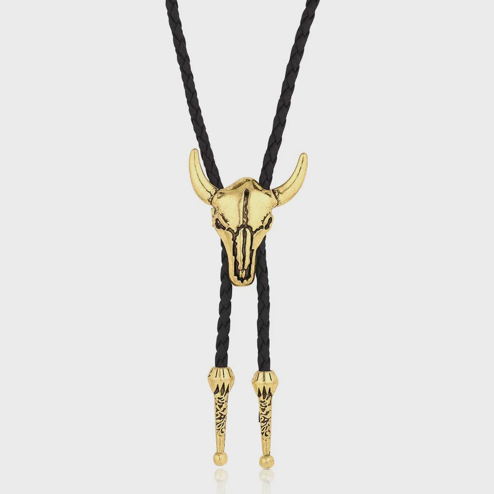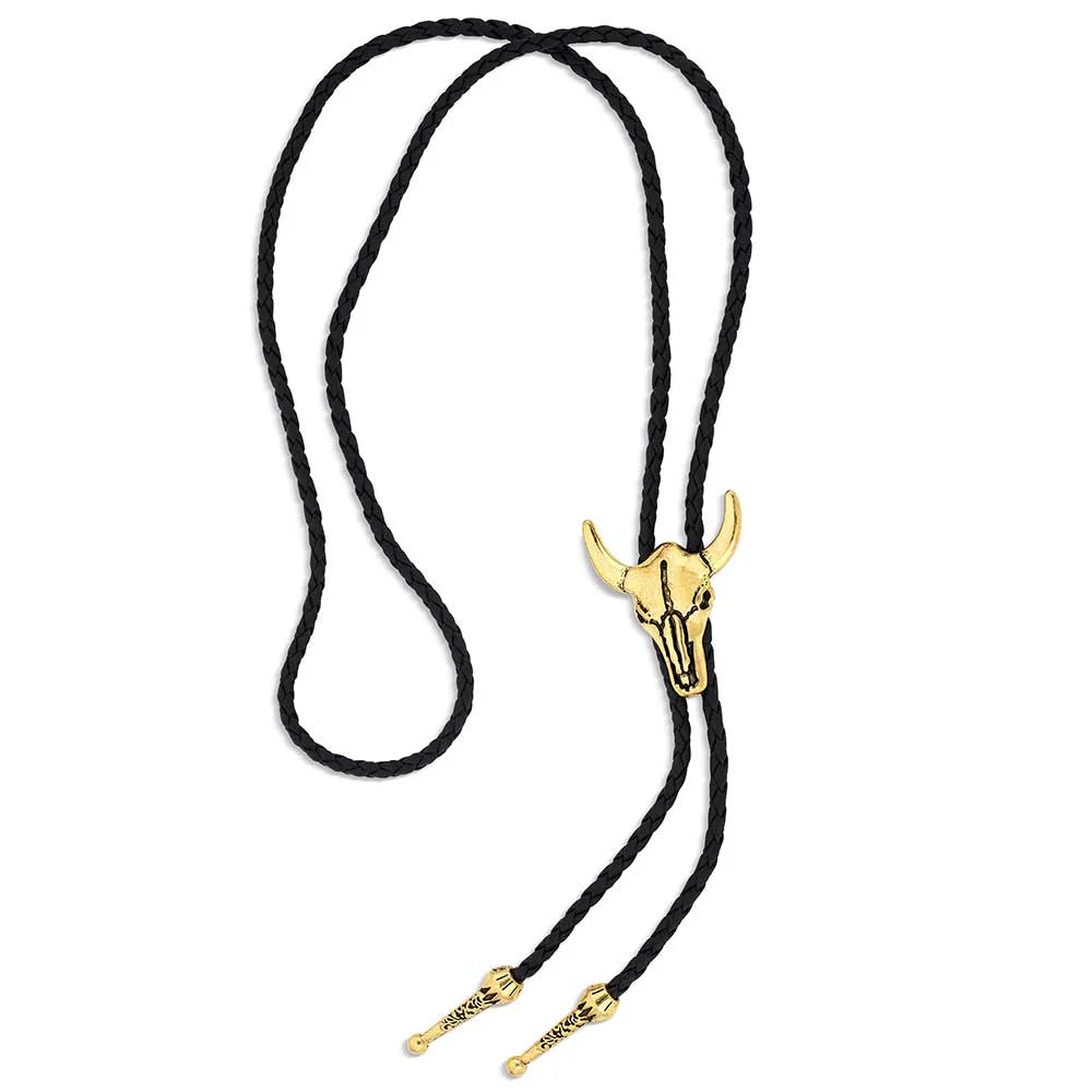 Bolo ties are all the buzz and this Southwest Desert Bolo Tie is no exception. A gold tone skull with black paint for detail is the focus for this piece. The skull can slide up or down on a black braided leather cord. Antiqued golden bolo tips complete the look. The cord is 20 inches.
