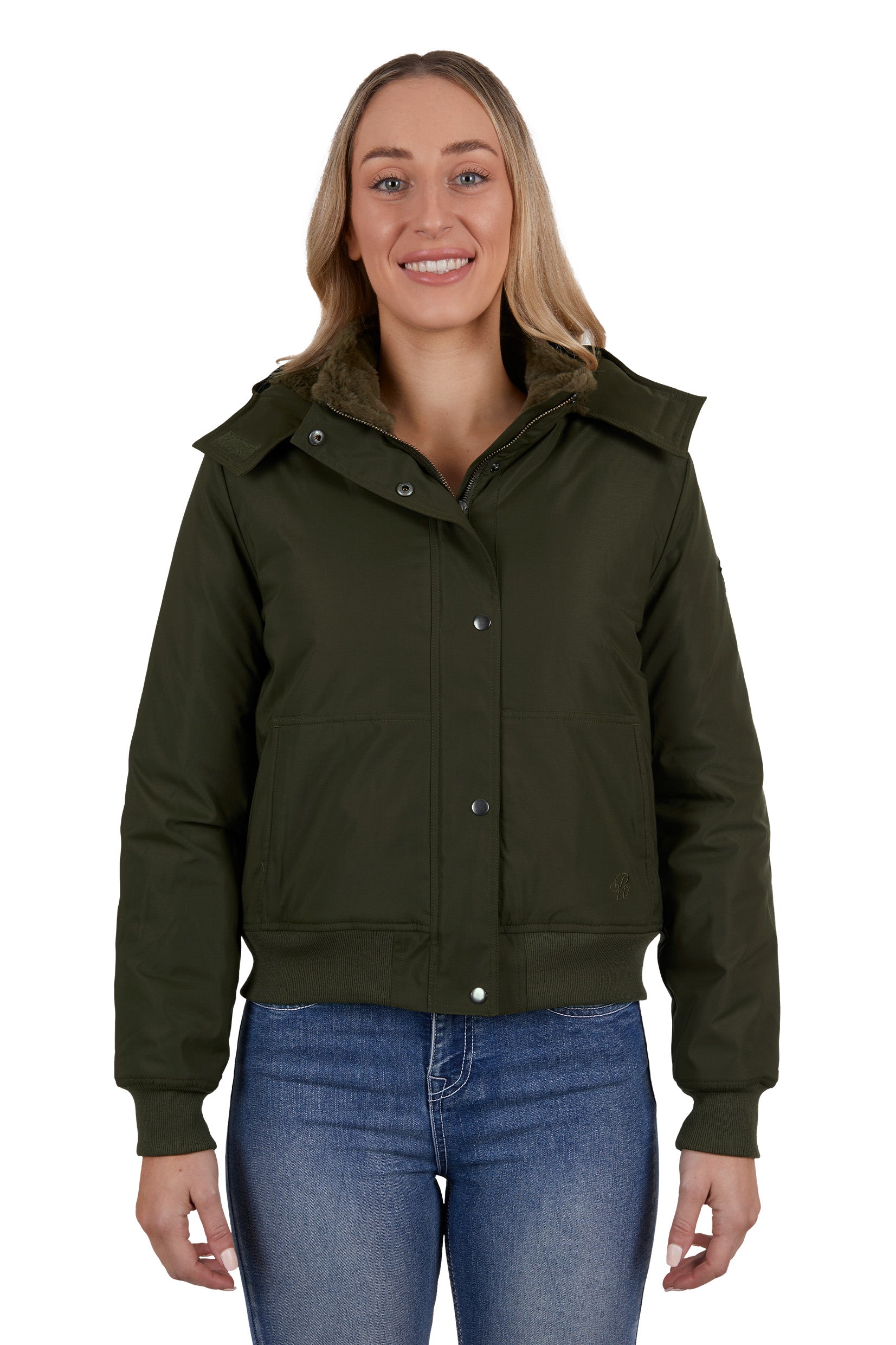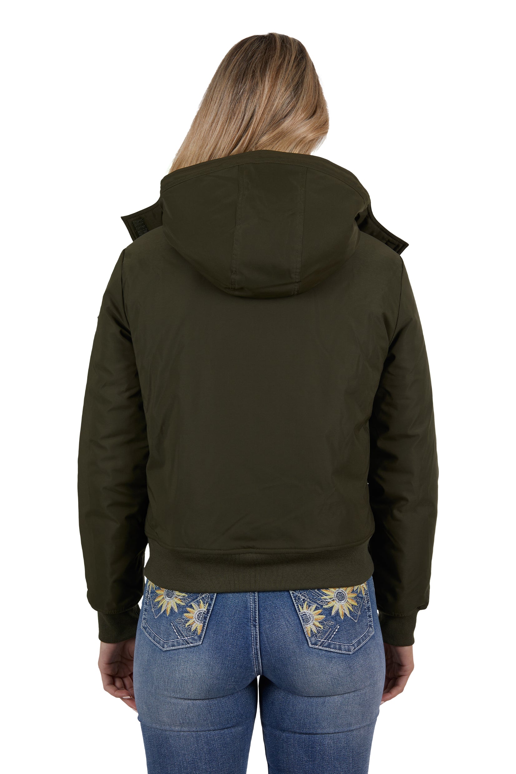 Zip through padded bomber jacket with detachable hood, water resistant softshell fabric, internal fur body, hood and collar lining for comfort and warmth, rib cuffs and hem, front kanga patch pockets, front storm flap with concealed zip closure and metal snaps, rust proof metal accessories, Pure Western embroidery on pocket.