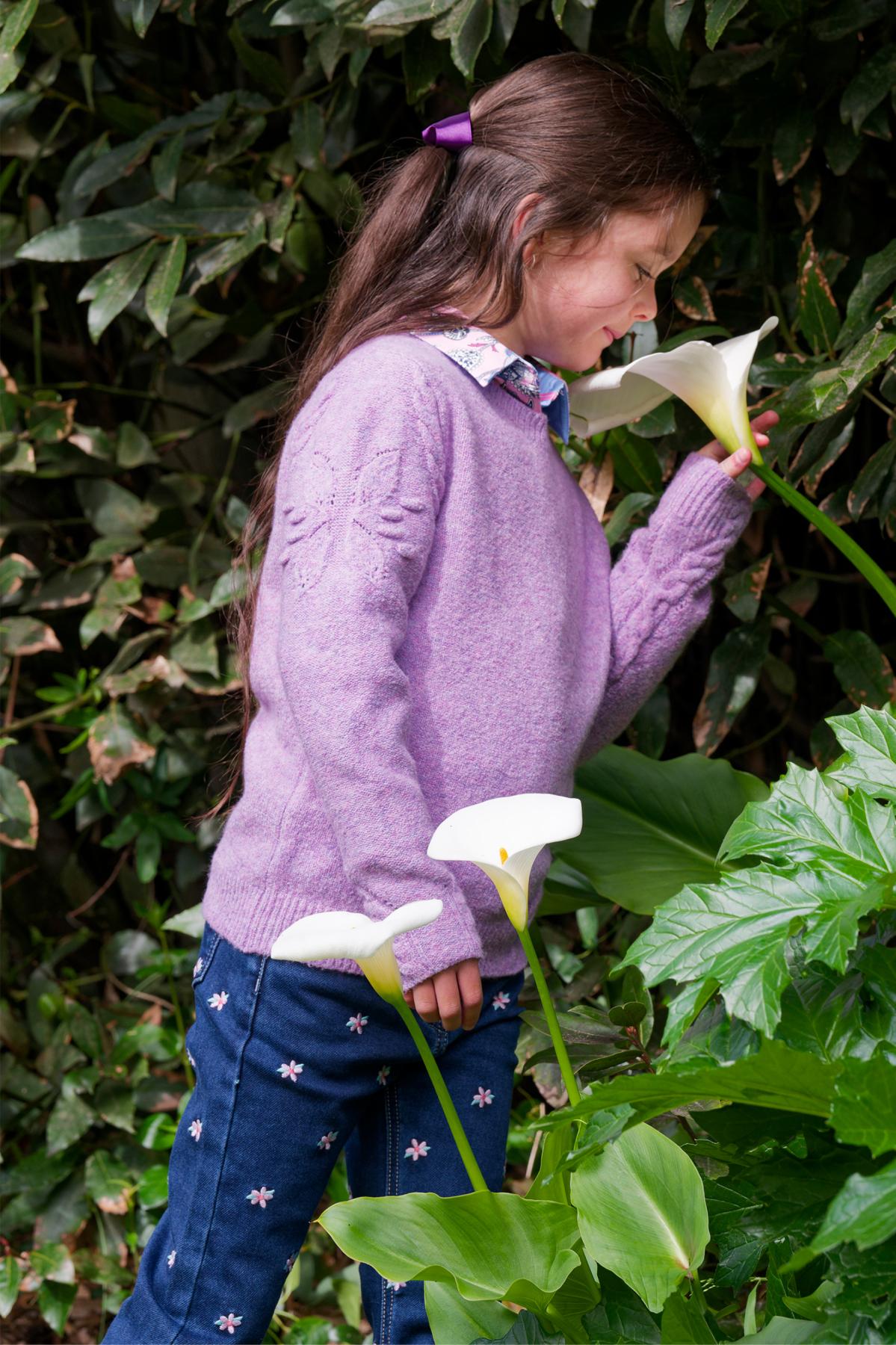 Lightweight fully fashioned cable knit, large front and sleeve feature cable, floral feature detail on sleeves, rib neck, cuffs and hem to keep shape, horseman embroidery on side hem.