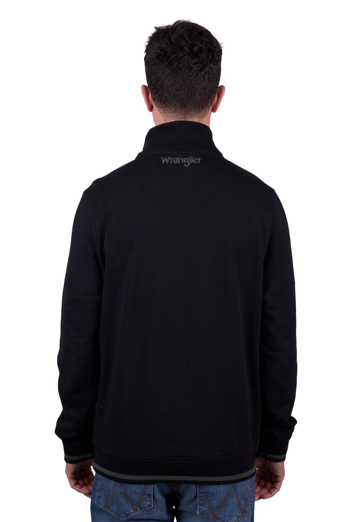 Medium weight french terry 1/4 zip pullover, contrast rib trim on inner collar facing, front welt pockets, rib trim (pockets, neck, hem and cuffs), contrast stripe tipping on rib hem and cuffs, Wrangler® iconic logo hem label.