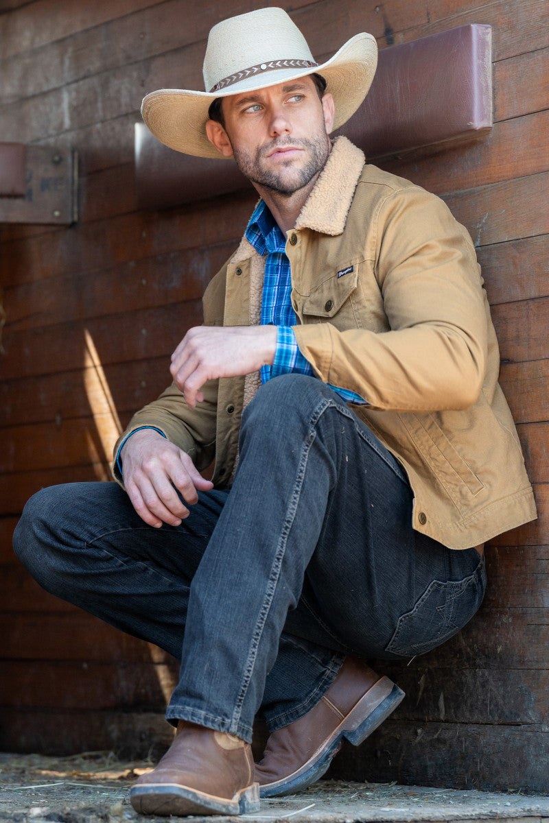 Classic Wrangler® trucker style canvas jacket, stretch for comfort and movement, front side welt pockets, adjustable sleeve cuffs and hem band with metal snaps, internal chest pocket, rust proof metal trims.