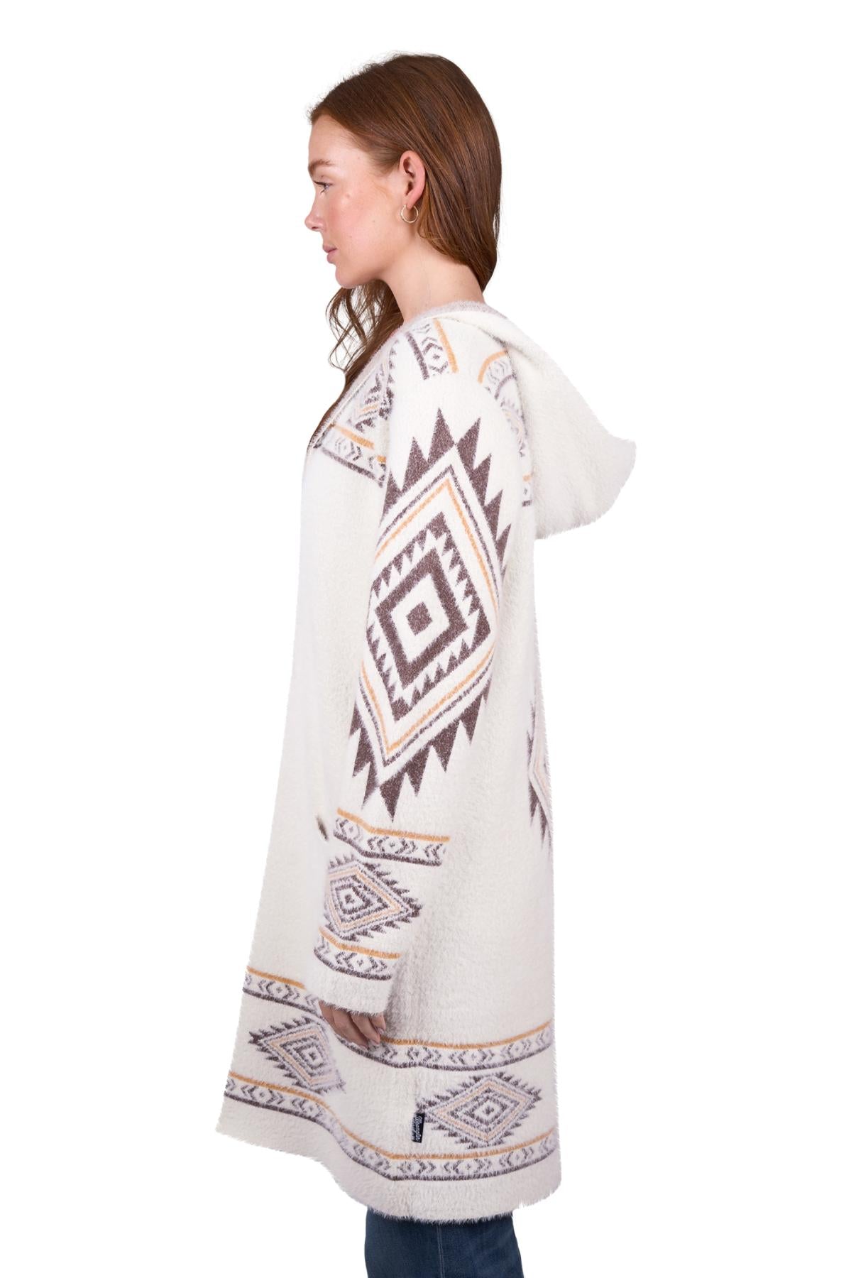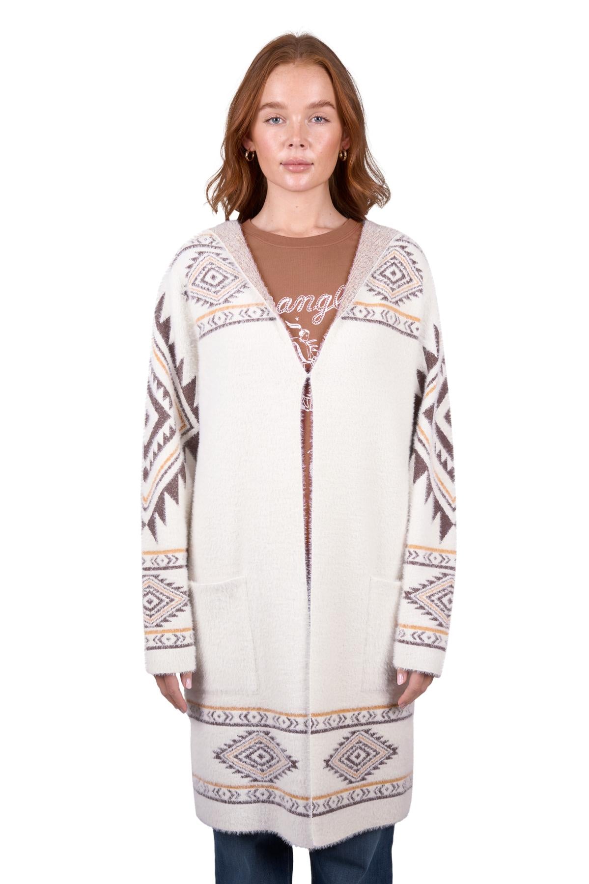 Fully fashion knitted cardigan with hood, longer line style, hook and eye closure, front patch pockets, Wrangler® logo pip on side seam.