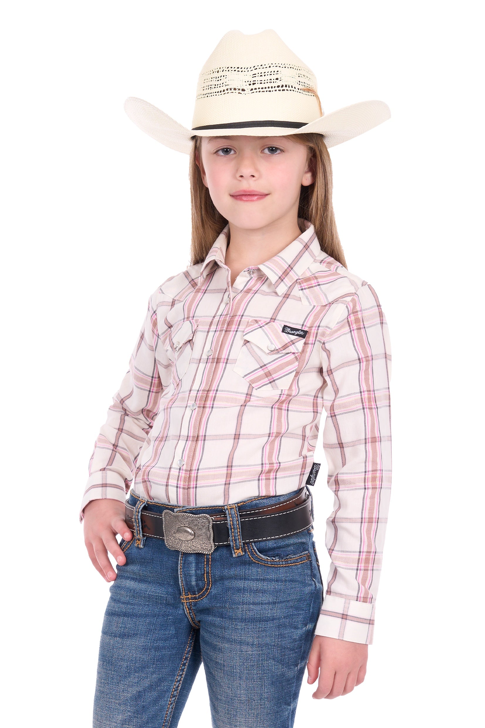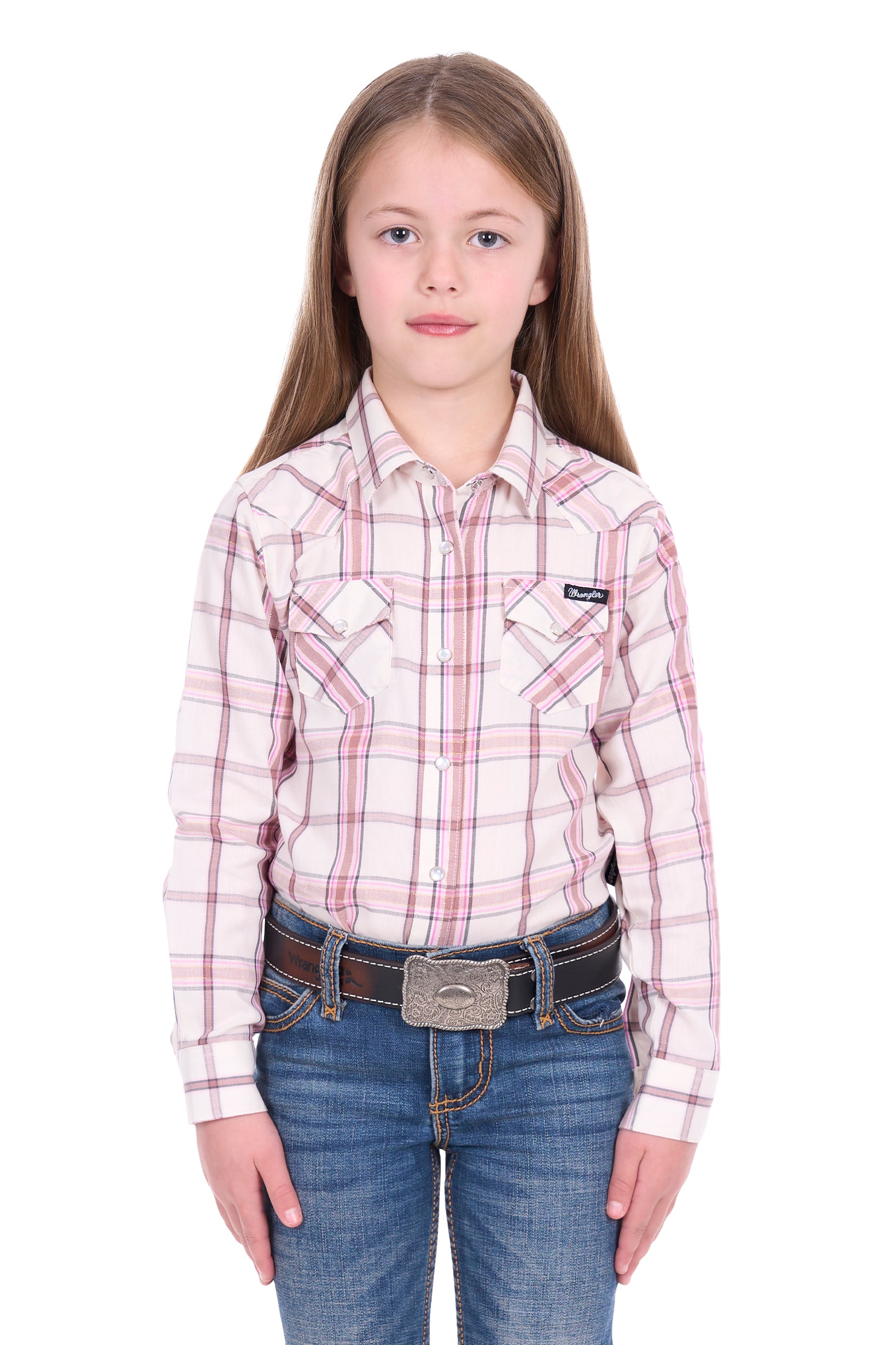 Classic girls Wrangler western long sleeve shirt, pearl snap closure, western chest pockets, western front and back yokes, Wrangler® logo pip on side seam.