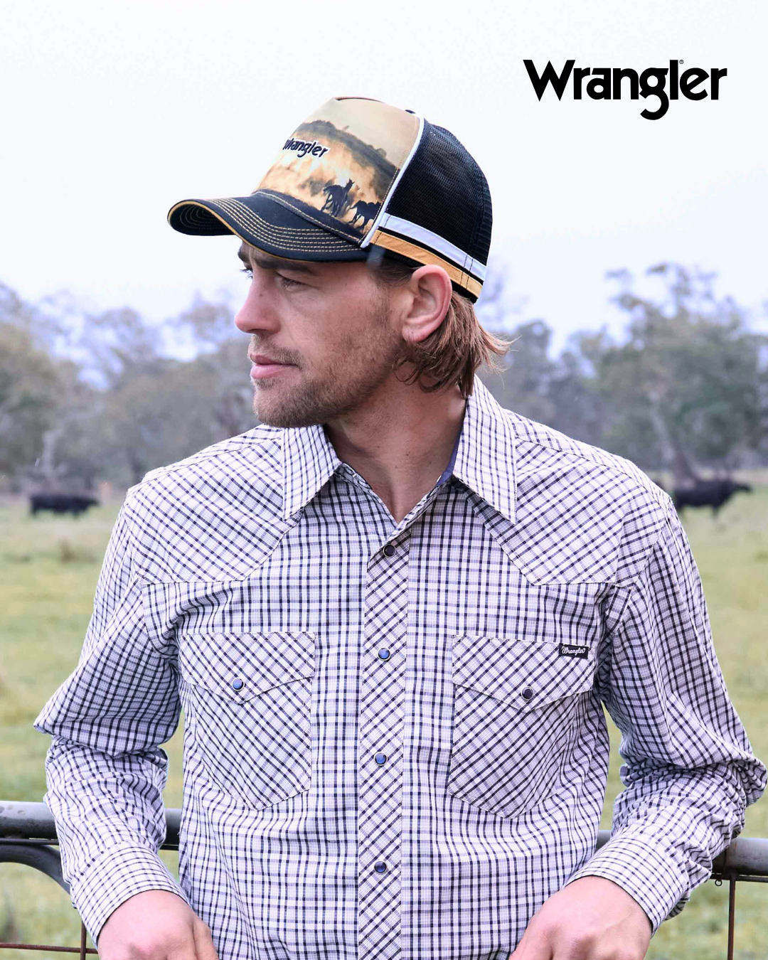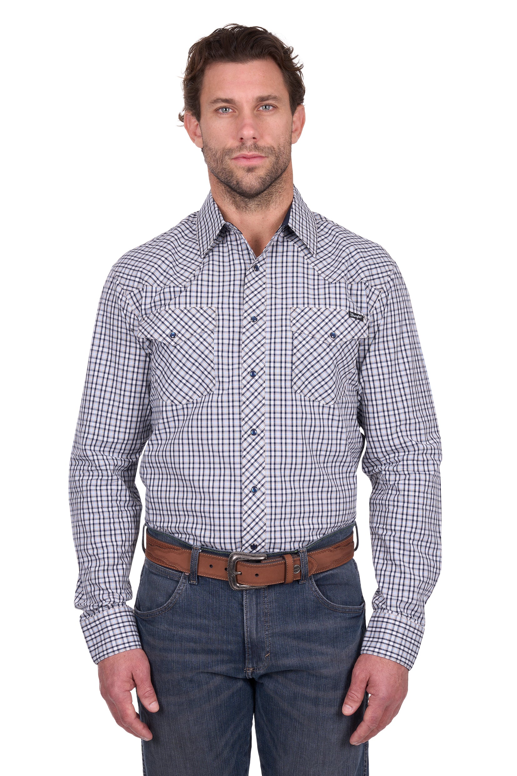 Classic mens Wrangler western long sleeve shirt, snap closure, western chest pockets (one with pen holder), western front and back yokes, contrast trim on inside collar stand.