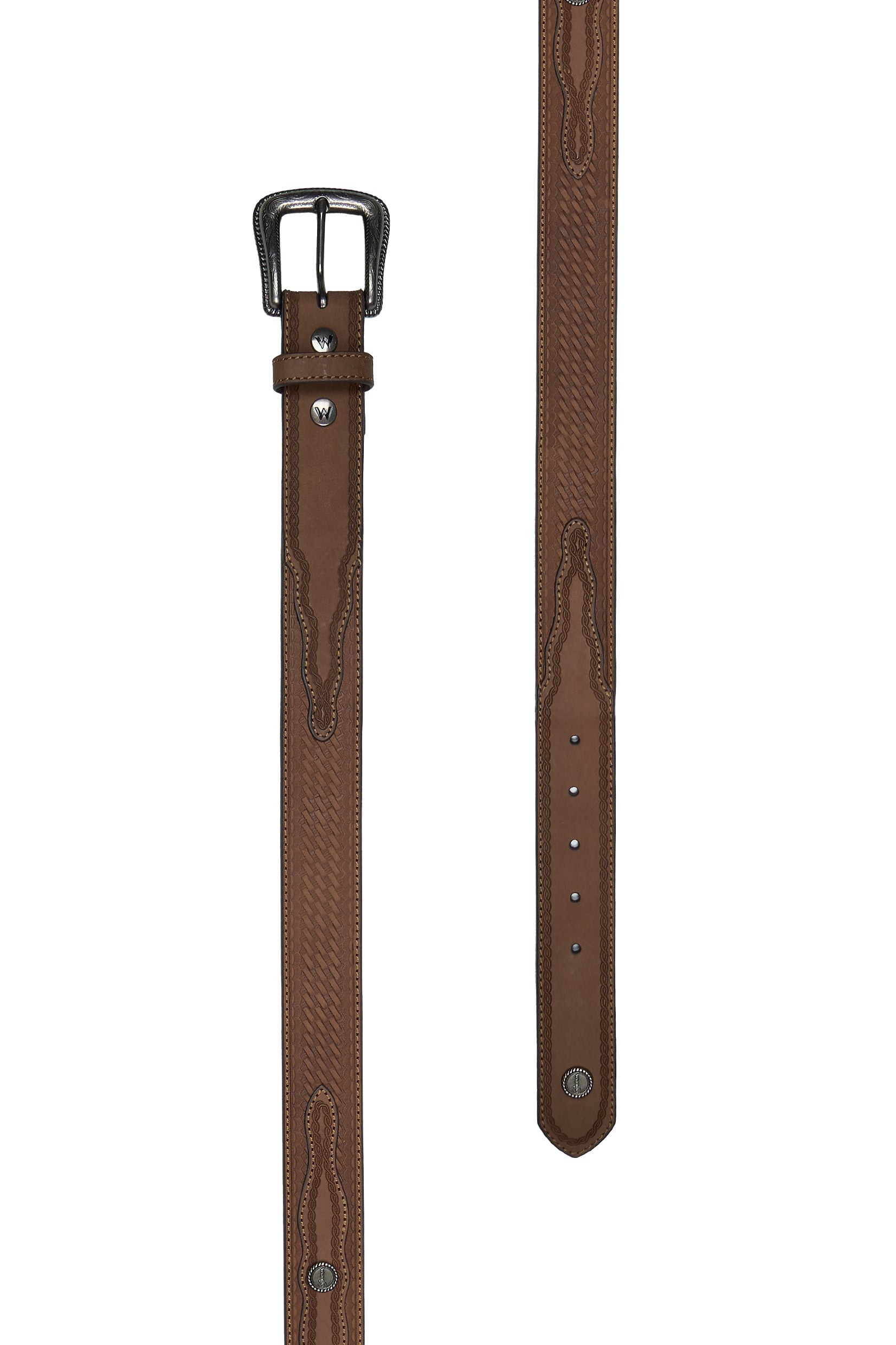Tan genuine leather belt with tooled tab ends, a removable buckle, Wrangler® iconic concho, and antique silver hardware.