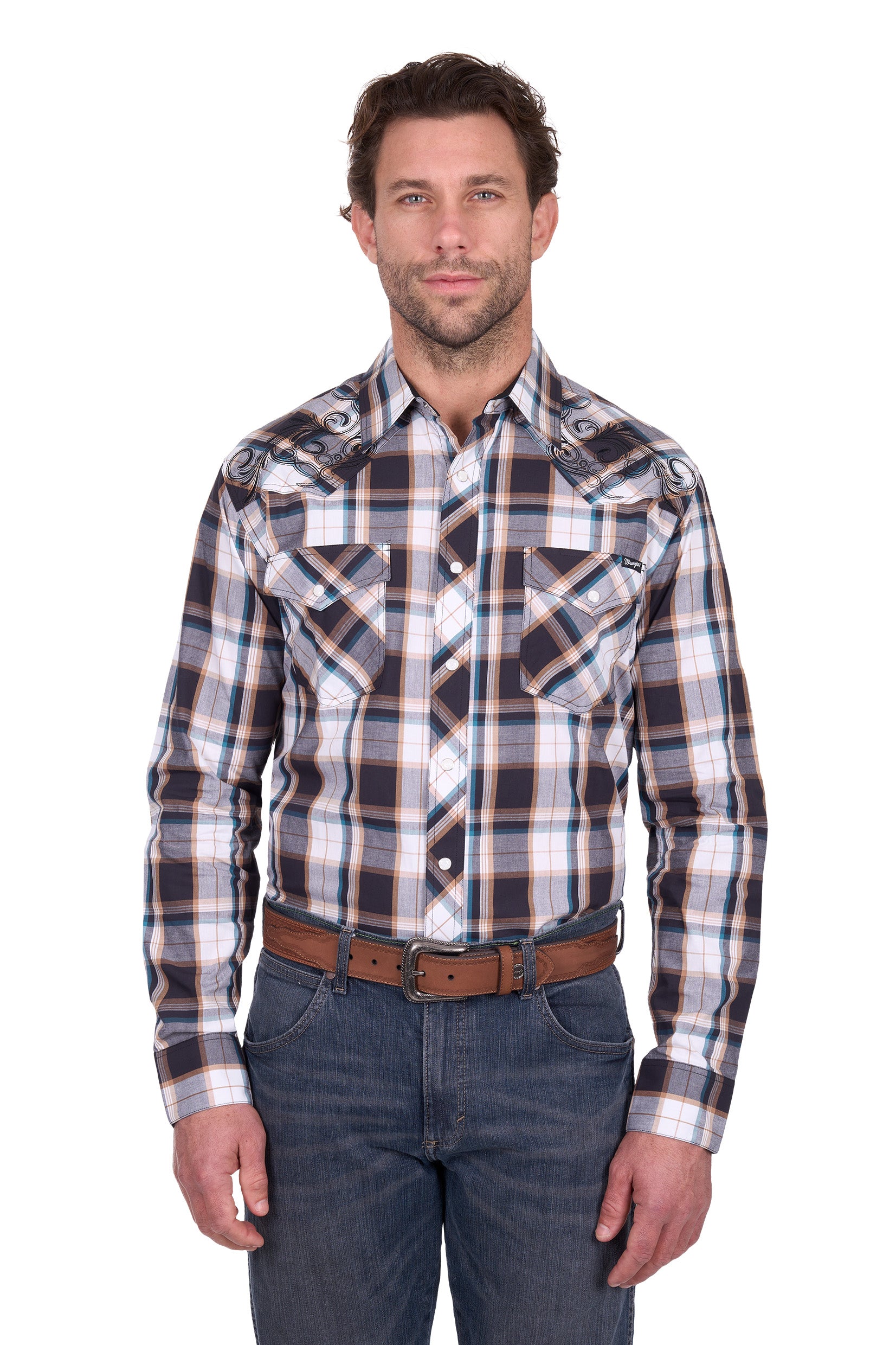 Wrangler Mens Ricky Embroidered Long Sleeve Shirt in Black and Tan