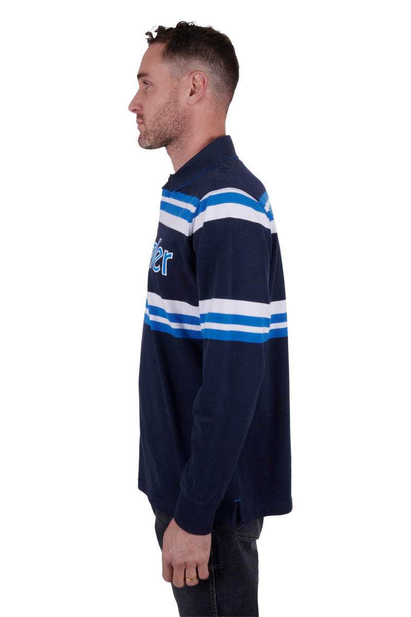 Heavyweight jersey knit rugby, concealed buttons on centre front placket, cotton drill collar with contrast underside, contrast herringbone tape trims on inside side seam splits, rib trim cuffs