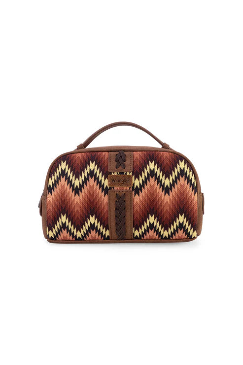 Crafted from vegan leather and cotton canvas, this compact toiletry bag is designed for lasting use—perfect for weekend getaways or everyday travel. Featuring a bold Aztec bandana print and an embroidered Wrangler logo, it brings a stylish Western flair to your essentials. The top zipper closure keeps your items secure and prevents leaks or spills while you're on the move. A convenient zippered back pocket offers quick access to smaller essentials like lip balm, keys, or cards. Sized at 9.5″ × 3.3″ × 6″, this mini makeup bag fits easily into your luggage or tote—ideal for organizing your must-haves on the go.